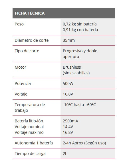 La batería extraíble otorga libertad de movimiento y gracias al accesorio del cable prolongador se puede escoger entre el funcionamiento con batería incorporada o transportarla a parte según las condiciones y tiempo de trabajo.
